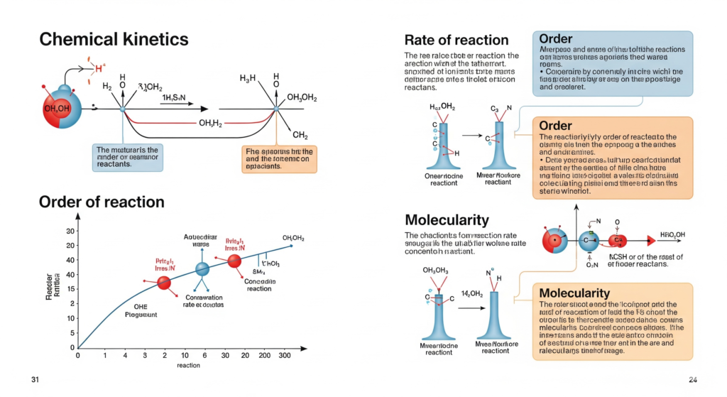 রাসায়নিক গতি (Chemical Kinetics) এমন একটি শাখা, যা রাসায়নিক বিক্রিয়া কীভাবে এবং কত দ্রুত ঘটে তা বিশ্লেষণ করে। এই অধ্যায়ে আমরা বিক্রিয়ার গতি (Rate of Reaction), আদেশ (Order) এবং আণবিকতা (Molecularity) সম্পর্কে বিস্তারিত জানব।