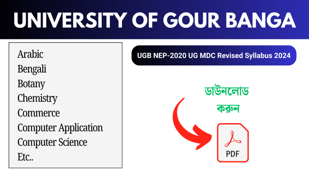 এই পেজে গৌড়বঙ্গ ইউনিভার্সিটির (UGB) নতুন শিক্ষা নীতি (NEP-2020) অনুযায়ী Undergraduate (UG) MDC (Multidisciplinary Course) Revised Syllabus 2024 প্রদান করা হয়েছে। আপনার প্রয়োজনীয় বিষয়ের উপর ক্লিক করুন এবং সরাসরি PDF এক্সেস করুন। আপনি চাইলে PDF ডাউনলোড করতে পারেন অথবা অনলাইনেই পড়তে পারেন।