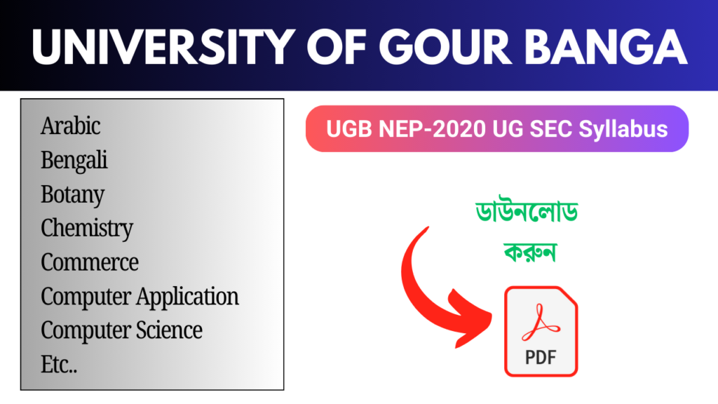 এই পেজে গৌড়বঙ্গ ইউনিভার্সিটির (UGB) নতুন শিক্ষা নীতি (NEP-2020) অনুযায়ী Undergraduate (UG) SEC (Skill Enhancement Course) Syllabus প্রদান করা হয়েছে। আপনার প্রয়োজনীয় বিষয়ের উপর ক্লিক করুন এবং সরাসরি PDF এক্সেস করুন। আপনি চাইলে PDF ডাউনলোড করতে পারেন অথবা অনলাইনেই পড়তে পারেন।
